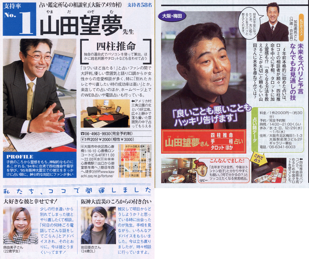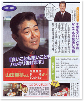 • 「芸人ご用達。M-1やR-1の優勝もズバリ的中!」と紹介していただいています。あの有名芸人さんなど、様々な芸能人や財界人、スポーツ選手などこれまで多数の著名人を鑑定させていただいております。